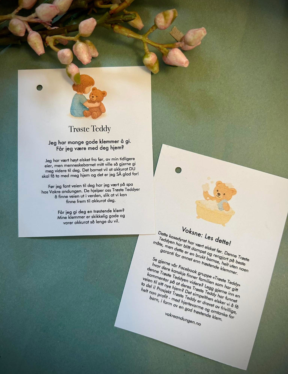 Trøste Teddyene er kosedyr som har vært elsket før (altså, de er brukte men alltid representative hele og pene) De er steamet og rengjort på beste måte.